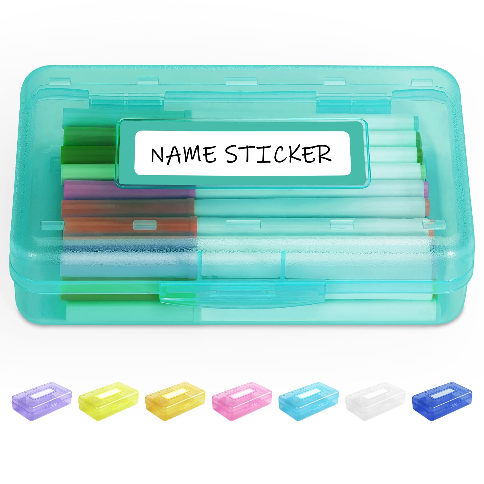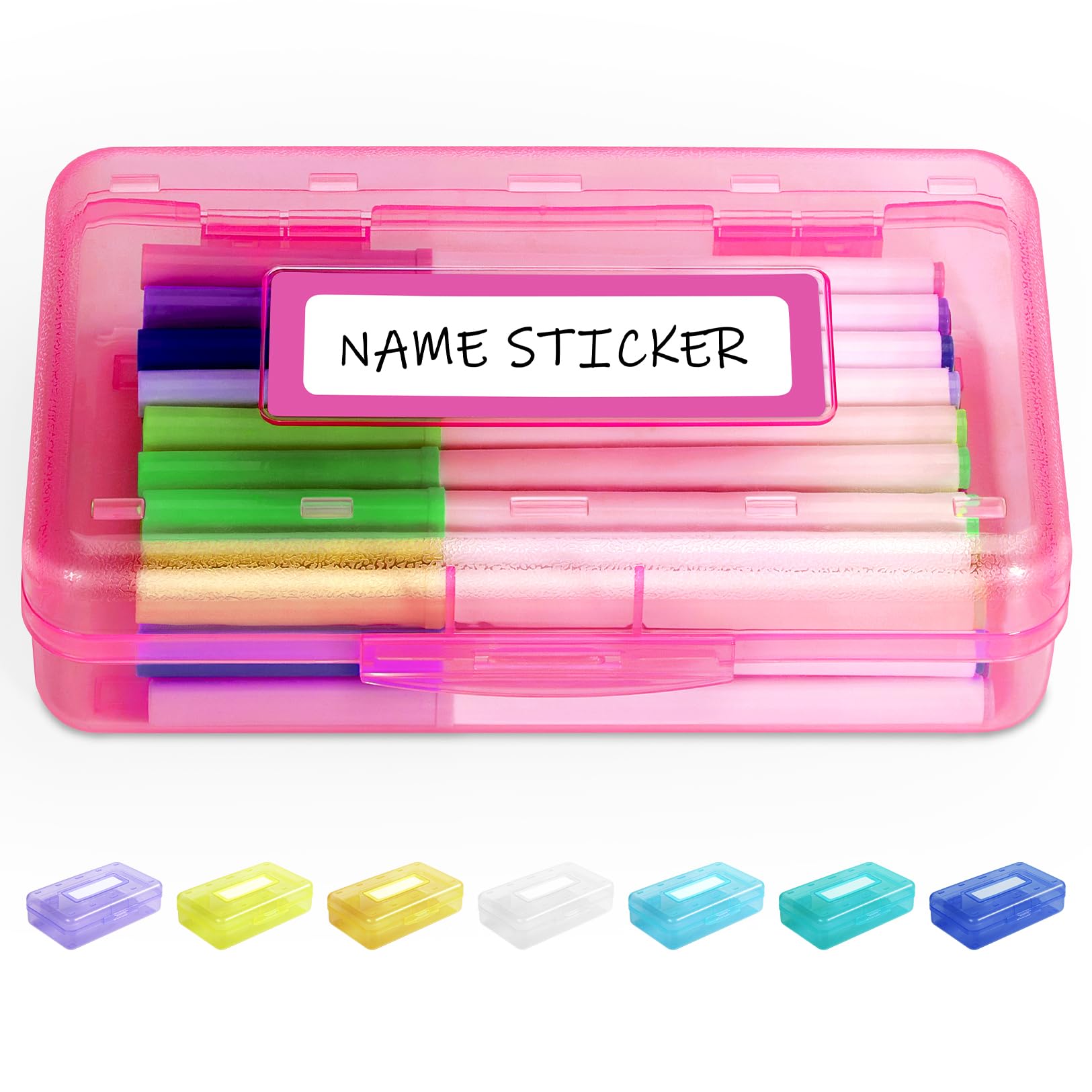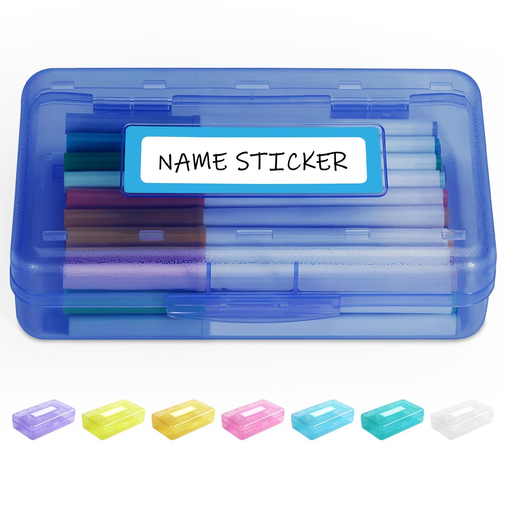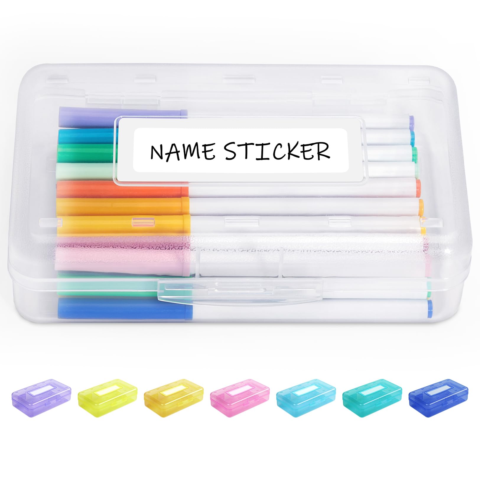 Sooez Pencil Box with Personalized Sticker, Large Hard Pencil Case Organizer, Clear Plastic Crayon Box for Girls and Boys, Colored Marker Organizer, Small Plastic Containers/Bins with Lids, Art Supply